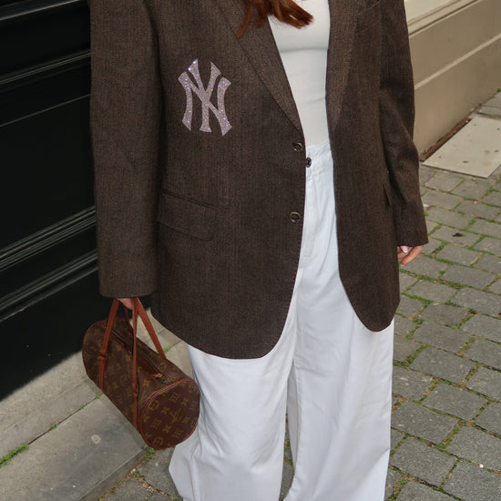 Vintage bruine oversized blazer one size, met een NY eyecatcher detail.