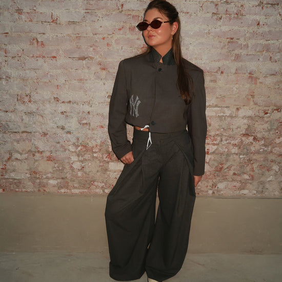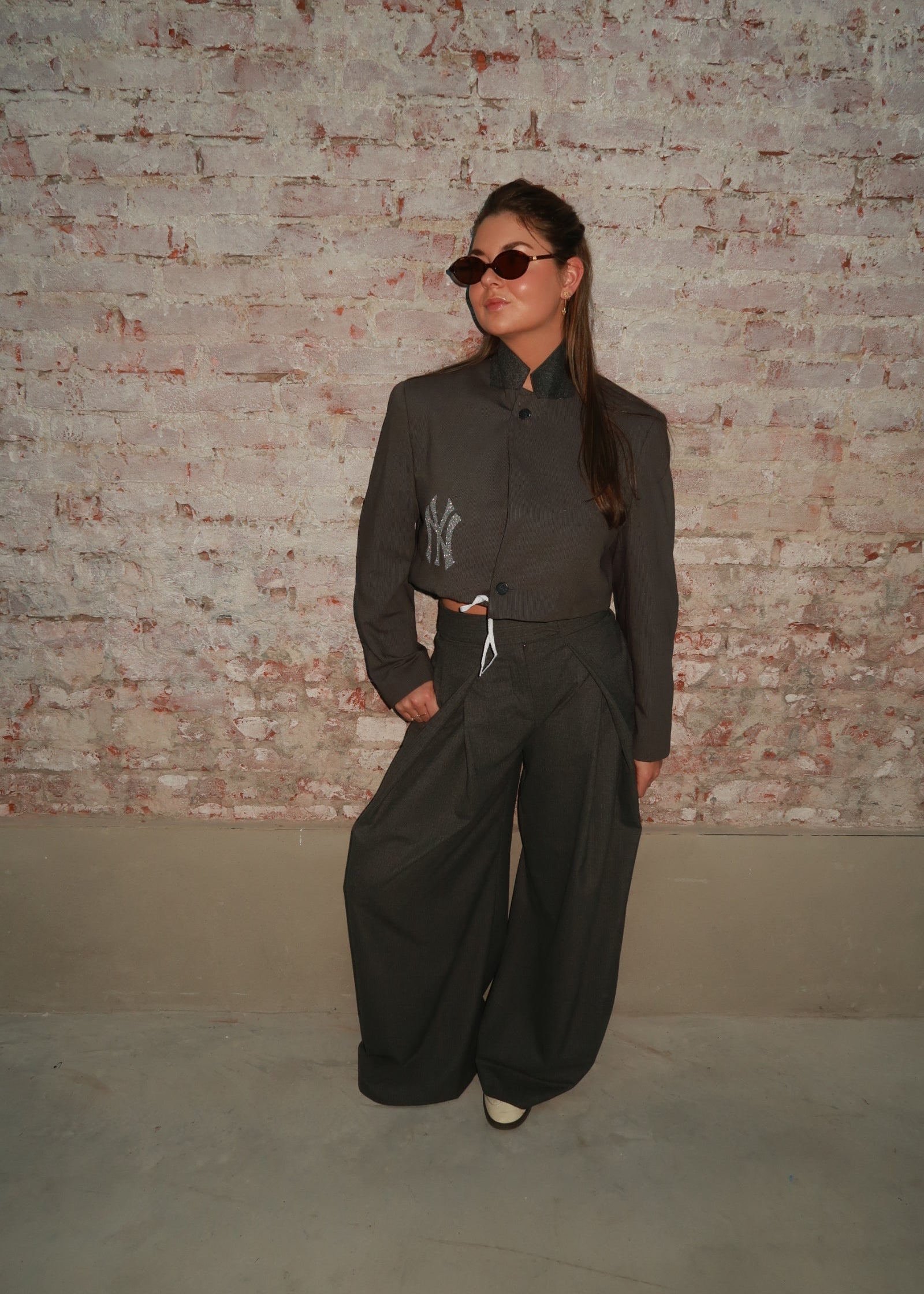 Vintage grijze blazer met een opvallend NY-detail en een knoop bij de kraag. De kraag kan zowel omhoog als omlaag gedragen worden voor een andere look. Blazer heeft een veter aan de onderkant zodat je hem strakker kan maken.