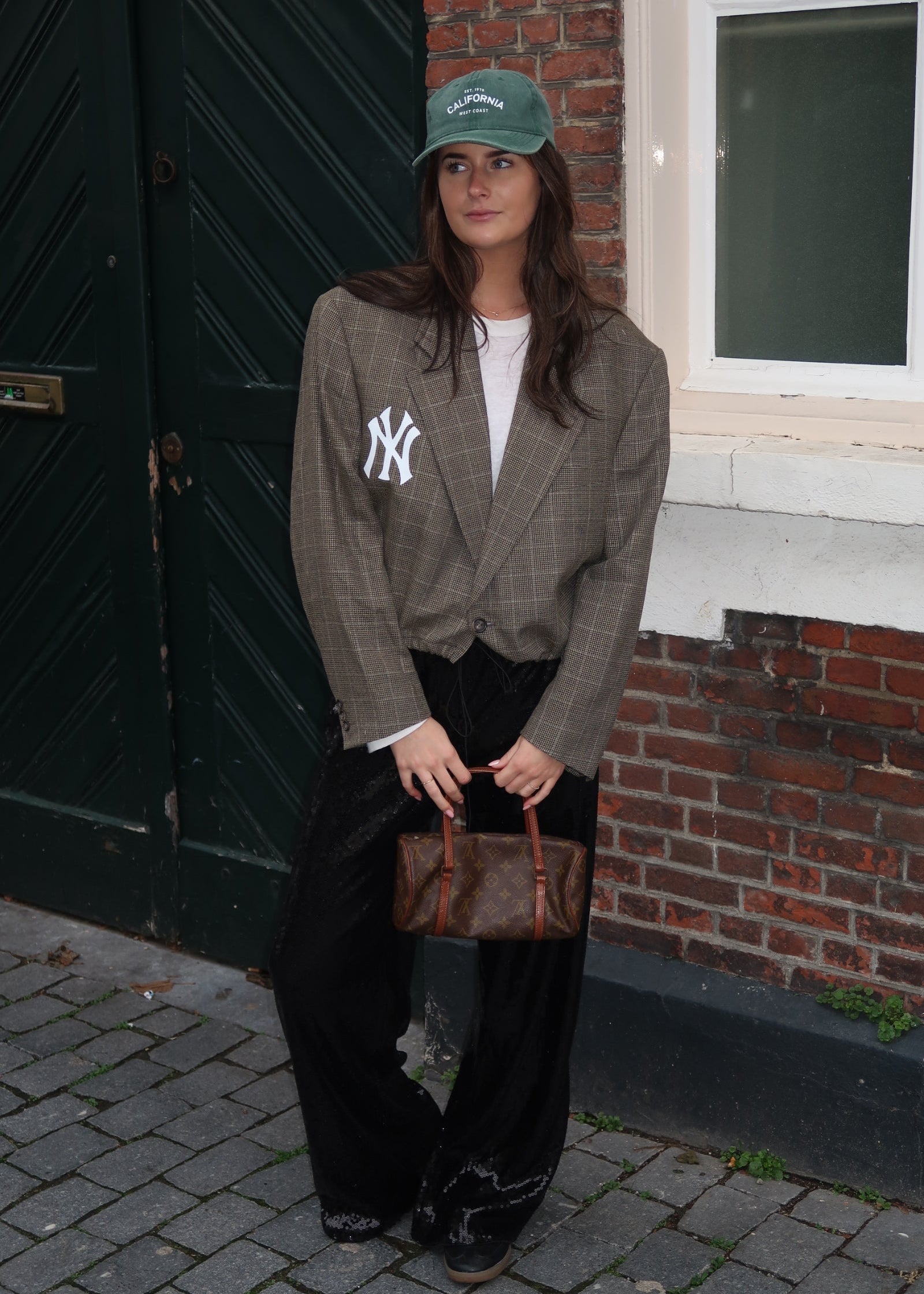 Vintage bruine cropped blazer met elastiek one size, met een opvallend NY detail.